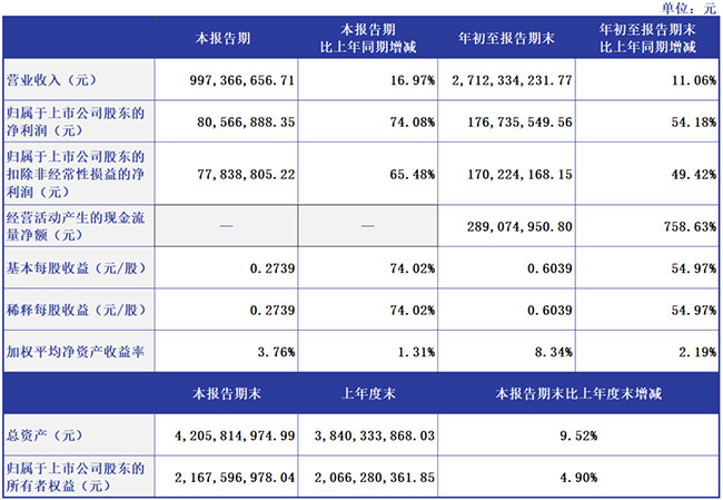 其中,,,,, ,,第三季度营收9.97亿元,,,,, ,,同比增添16.97%;;;;;;;归母净利润8056.69万元,,,,, ,,同比增添74.08%;;;;;;;基本每股收益0.2739元,,,,, ,,同比增添74.02% 。。 。。。。。