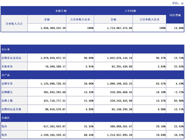 2024ÄêÉϰëÄ꣬£¬£¬£¬£¬£¬£¬¹«Ë¾¾³ÄÚÖ÷ÓªÓªÒµÊÕÈë6.17ÒÚÔª£¬£¬£¬£¬£¬£¬£¬Í¬±ÈÔöÌí23.45%¡£¡£¡£¡£¡£¡£¾³ÍâÖ÷ÓªÓªÒµÊÕÈë13.39ÒÚÔª£¬£¬£¬£¬£¬£¬£¬Í¬±ÈÔöÌí10.22%¡£¡£¡£¡£¡£¡£ÕûÌåÀ´¿´£¬£¬£¬£¬£¬£¬£¬³èÎïÖ÷Á¸Ð¢Ë³ÏúÊÛ¶îΪ4.22ÒÚÔª£¬£¬£¬£¬£¬£¬£¬Í¬±ÈÔöÌí83.96%¡£¡£¡£¡£¡£¡£